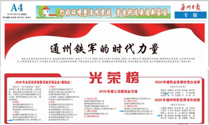 2020年,在董事會(huì)的正確領(lǐng)導(dǎo)和執(zhí)行層的努力拼搏下,公司全體員工團(tuán)結(jié)一心,努力克服新冠肺炎疫情的影響,堅(jiān)持穩(wěn)中求進(jìn),積極開拓市場(chǎng),推進(jìn)科技創(chuàng)新,取得了驕人的業(yè)績(jī)。公司再次榮獲“南通市通州區(qū)經(jīng)濟(jì)發(fā)展貢獻(xiàn)百?gòu)?qiáng)企業(yè)”一等獎(jiǎng),董事長(zhǎng)邱少波榮獲“2020年度建筑業(yè)發(fā)展優(yōu)秀企業(yè)家”,副總工程師曹震榮獲“2020年度通州鐵軍優(yōu)秀項(xiàng)目經(jīng)理”。新年伊始,公司將認(rèn)真貫徹通州區(qū)委十二屆十一次會(huì)議精神,攻堅(jiān)克難,砥礪奮進(jìn),再創(chuàng)輝煌。