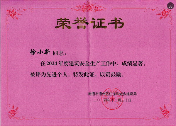 20241230日,南通市通州區(qū)住建局召開了“通州區(qū)2024年四季度建筑業(yè)安全生產(chǎn)形勢分析暨全年總結(jié)會(huì)”,集團(tuán)公司被評為2024年“先進(jìn)集體”,徐小新同志評為“先進(jìn)個(gè)人”。