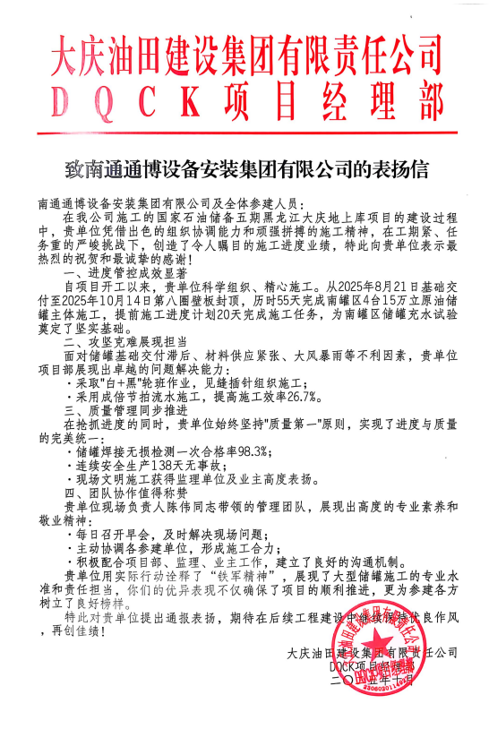 金秋十月的大慶,清風送爽,碩果盈枝。這片承載著光榮與夢想的熱土,在收獲的季節(jié)里煥發(fā)出更加蓬勃的生機。14日下午2點,第三分公司大慶DQCK項目部工地上,機器轟鳴、繁忙如常,在集團董事、常務(wù)副總趙偉斌的帶領(lǐng)下,正緊張進行第四臺15萬立方米儲罐的封頂作業(yè)。自今年5月進駐以來,項目部全體人員對標鐵人王進喜,將“鐵人精神”深深鐫刻在每一次精準操作、每一項技術(shù)突破之中。工地內(nèi)外,“通博風華”處處綻放——從高效推進項目進程,到精細管控降本增效;從安全生產(chǎn)的嚴謹細節(jié),到綠色低碳的堅定踐行。8月21日儲罐基礎(chǔ)交付至10月14日第八圈壁板封頂,僅歷時55天提前20天完成了南罐區(qū)4臺15萬立方米原油儲罐封頂,為南罐區(qū)儲罐充水試驗奠定了堅實基礎(chǔ)。大慶油田建設(shè)集團向我司函寄了表揚信,表揚全體參建人員克服了工期緊、任務(wù)重的嚴峻挑戰(zhàn),創(chuàng)造了令人矚目的施工進度業(yè)績;并向項目負責人陳偉頒發(fā)了“優(yōu)秀管理者”榮譽證書,盛贊了我司大型儲罐施工的專業(yè)水準和責任擔當!通博人以實干擔當詮釋新時代“鐵人精神”的深刻內(nèi)涵,以銳意進取、追求卓越展現(xiàn)“通博風華”。